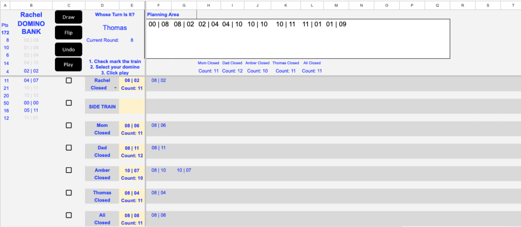 When the Covid-19 lock downs started, my family began weekly virtual game nights – but the games we could play over FaceTime were limited. I made it my personal challenge to see how I could use Google Sheets and Appscript to allow us to virtually play our favorite game – Mexican Train. Give it a try for yourself! If you win a round, you’ll get a surprise. You will need to authorize access to the script file in order for the game to work.